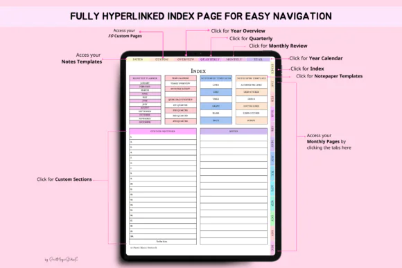 Designed in a portrait layout, this planner includes over 500 hyperlinked pages with smooth navigation between yearly, quarterly, monthly, weekly, and daily sections. It also includes 20 custom sections, allowing you to personalize the planner for goals, projects, trackers, work, study, or other life areas that matter most to you.