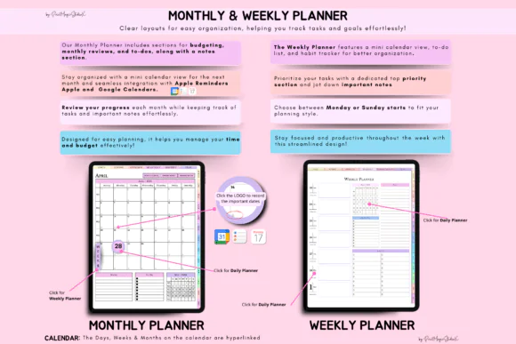 A standout feature of this planner is its Apple Calendar, Reminders, and Google Calendar integration, helping you streamline your digital life and keep your events and tasks more connected. The planner is also reusable, eco-friendly, fully erasable, and easy to customize with stickers, images, widgets, and duplicated pages as needed.