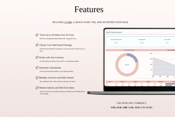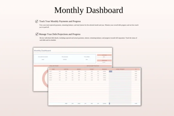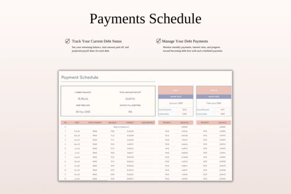 The included global dashboard helps you monitor your overall debt reduction progress, view projected payoff dates, and understand your debt repayment timeline at a glance. The payment schedule and tracker show how each debt will be paid over time, while the monthly overview and journal tab help you stay accountable and motivated throughout your debt-free journey.