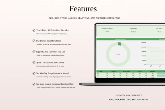 With the ability to track up to 50 debts for up to 50 years, this tracker is useful for credit cards, loans, medical bills, student loans, car loans, personal loans, business debts, store financing, and other repayment obligations. Automatic calculations help you review payment progress, interest, balances, extra payments, and projected debt-free dates without doing manual math.