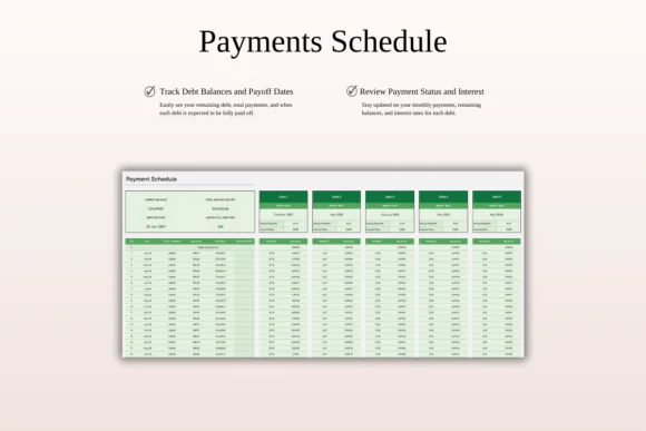 The template includes a clear dashboard, monthly overview, built-in journal, payment schedule, and payment tracker. You can compare actual payments with your planned goals, organize payments by category, and use the journal section to stay accountable throughout your debt payoff journey.