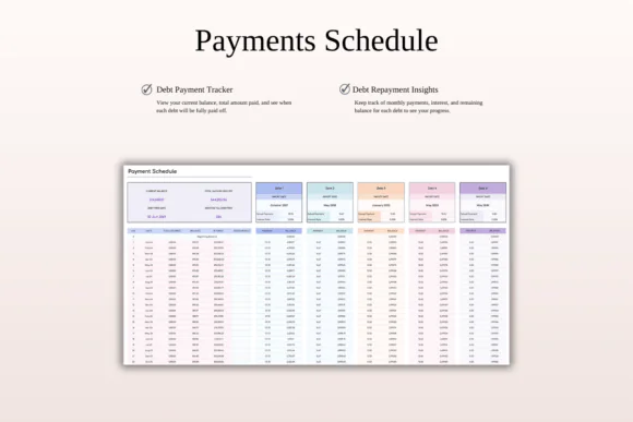 The dashboard helps you see your progress in real time, while the payment schedule shows how your debt plan unfolds over time. With Snowball, Avalanche, and custom repayment options, the template adapts to your strategy and helps you stay focused until each debt is paid off.