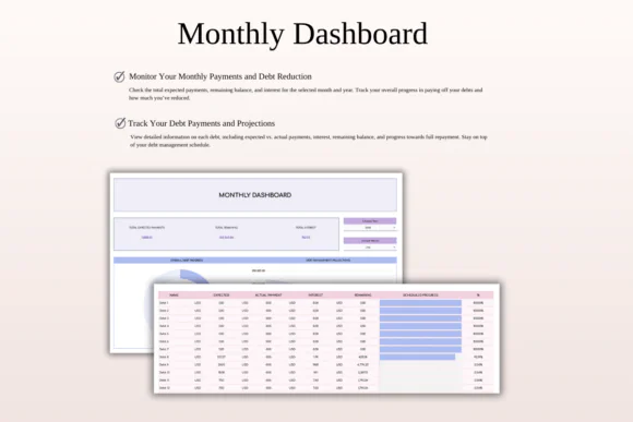 View your total debt progress, monthly goals, remaining balances, payoff status, and repayment overview from one clear dashboard.