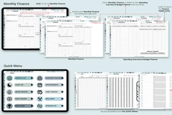 - Finance trackers such as purchase tracker, wish list, subscription tracker, monthly finance, spending overview, budget planner, yearly finance overview, no spend challenge, debt snowball tracker, bank account tracker, saving tracker, bill payment, and sinking funds