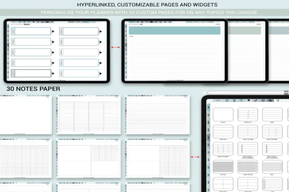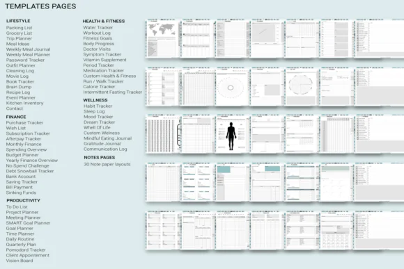 - Lifestyle trackers such as packing list, grocery planner, trip ideas, meal log, weekly meal journal, weekly meal planner, password tracker, outfit planner, cleaning log, book tracker, movie log, brain dump, event planner, kitchen inventory, and contacts