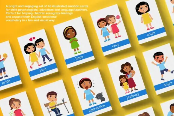 Ideal for child psychologists, counselors, educators, language teachers, homeschoolers, and parents, these cards can be used in therapy sessions, classroom discussions, social-emotional learning activities, and language development exercises. The set features expressive illustrations that bring emotions to life, making it easier for children to identify feelings such as joy, surprise, anger, envy, sadness, and more.