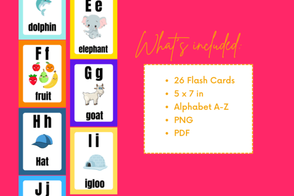 This set includes 26 alphabet flash cards, one for each letter of the English alphabet. Every card features a letter along with a matching picture and a word that begins with that letter, making it easier for children to remember sounds, associations, and word patterns in a visual and interactive way.