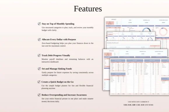 The Monthly Budget Sheet helps you organize income and spending into clear categories. The Sinking Funds Tracker helps you save ahead for planned expenses such as vacations, car maintenance, annual bills, holidays, gifts, home repairs, and special events. The Debt Tracker Dashboard helps you stay motivated with visual progress tools, while the Zero-Based Budget Template ensures your money is planned intentionally. The Quick Budget Planner is ideal for fast, everyday budgeting when you want a simple and no-fuss approach.
