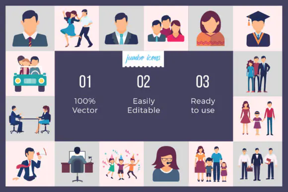 Bring more life and personality to your creative projects with this versatile Flat Vector Icons People Set. This pack includes 50 flat vector people icons featuring a wide variety of characters, professions, poses, and everyday human interactions, making it a highly useful resource for designers, developers, marketers, and content creators.
