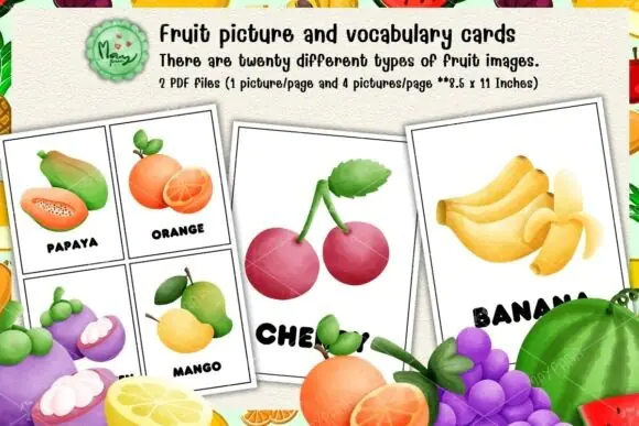 This set features 20 different fruits, making it a helpful resource for preschool, early elementary, homeschool lessons, classroom activities, food vocabulary practice, and early recognition learning. The vibrant illustrations help children stay interested while building vocabulary and connecting fruit names with familiar images in a memorable way.
