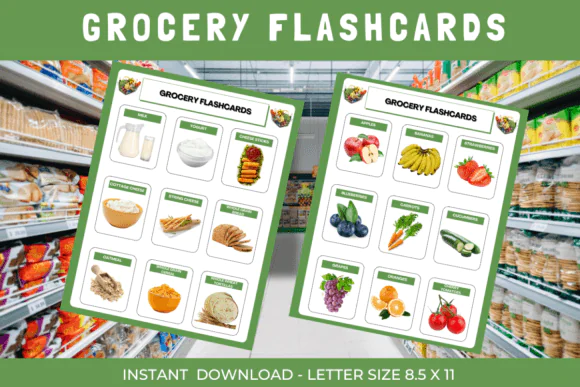 This set features a wide variety of common grocery store items, including fruits, vegetables, dairy products, snacks, and other familiar foods children see in daily life. Each card is designed with clear, colorful visuals and easy-to-read text, making the set perfect for hands-on learning and interactive classroom or home activities.