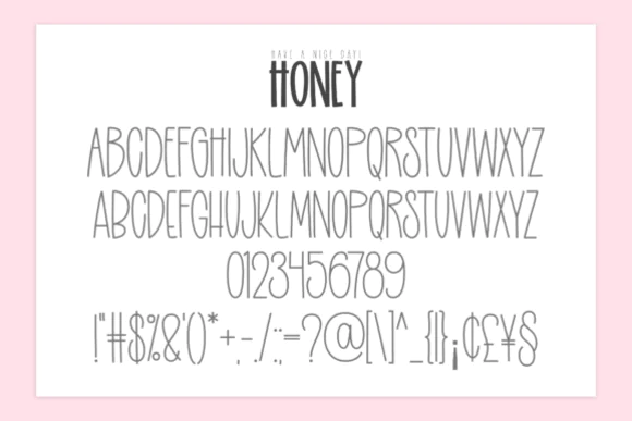 The main Honey font features quirky proportions, rounded edges, and an organic hand-drawn style that feels modern, playful, and full of charm. The secondary Have a Nice Day! font adds a delicate, airy handwritten touch, making it ideal for accent words, supporting text, quotes, and decorative typography combinations.