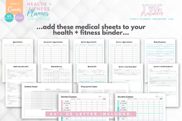 This planner also includes valuable wellness and medical organization pages such as protein shake recipes, recipes to try, fitness expenses, 28 day diet worksheet, Keto, Paleo and Vegan shopping lists, medical info sheet, medical history, doctor visitation record, doctor visit prep sheet, appointment sheets for various medical needs, medical expenses tracker, insurance expenses tracker, health insurance info, 4 month calendar, first aid kit checklist, water tracker, prescriptions tracker, and vitamins tracker. This makes the bundle especially useful for users who want more than just a workout planner and need a full lifestyle and health management system.