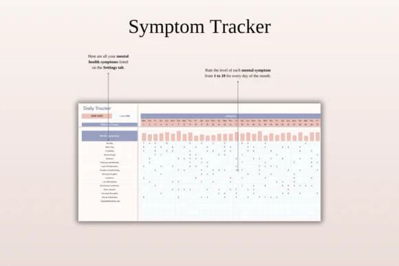 With the daily log, you can record important wellness metrics such as mood, sleep quality, energy levels, exercise, hydration, work-life balance, self-care habits, symptoms, weight changes, and total wellness score. Physical and emotional symptoms can be rated on a simple 1–10 scale, making it easier to notice trends and identify patterns over time.