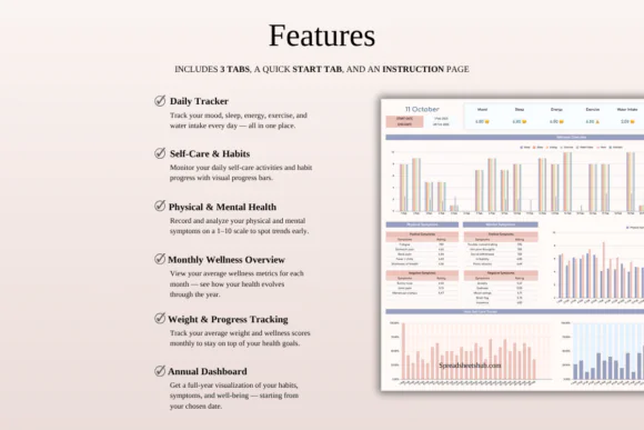 This tracker is perfect for anyone who wants a clear and organized way to monitor their physical, mental, and emotional well-being. Whether you are working on healthier routines, managing stress, improving sleep, increasing hydration, building exercise habits, or simply becoming more aware of your body and mood patterns, this spreadsheet gives you a practical system to stay consistent.
