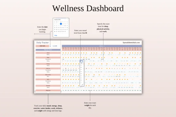 Take charge of your wellness journey with this Health Metrics Tracker Spreadsheet Template for Excel and Google Sheets. Designed as an all-in-one health and wellness dashboard, this template helps you track daily health habits, monitor physical and emotional symptoms, review monthly averages, and understand your overall progress throughout the year.