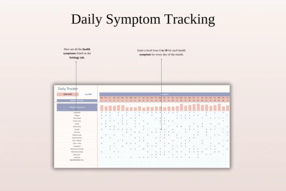 The template includes a Self-Care Overview, Symptom Insights, Monthly Summary, and Yearly Dashboard, helping you visualize your health journey from day to day, month to month, and across the full year. These dashboards make it easier to see what habits are improving, where you may need more attention, and how your overall wellness changes over time.