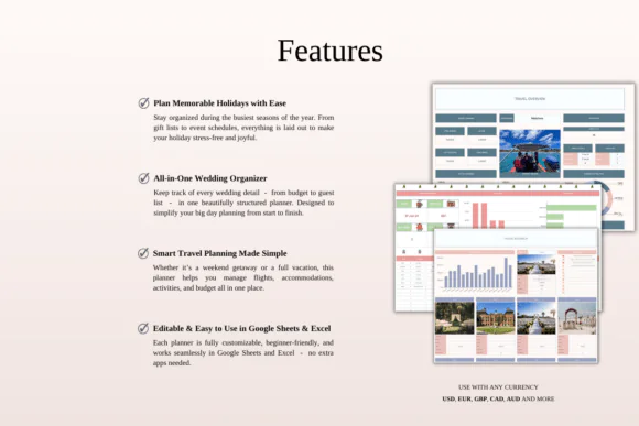 Plan holidays, weddings, trips, and special occasions with less stress using this Holiday and Special Event Planners Bundle for Excel and Google Sheets. This all-in-one planning toolkit is designed to help individuals, couples, families, travelers, and event organizers manage important celebrations with clear structure, organized details, and reusable spreadsheet systems.