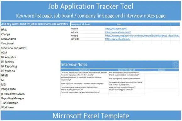 Organize your job search with confidence using this Job Application Tracker Tool for Microsoft Excel. This easy-to-use spreadsheet is designed to help job seekers track applications, monitor interview stages, manage offers, save job search keywords, organize job board links, and prepare for interview questions in one structured place.