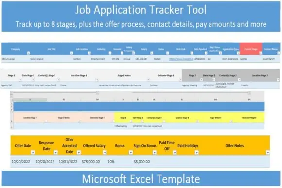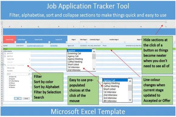 The template includes dropdown lists to speed up data entry, collapsible sections to keep the spreadsheet clean, and color-changing rows that highlight applications when the status is changed to Offered or Accepted. It also includes dedicated tabs for job search keywords, favorite job boards and recruitment links, and interview preparation notes, making it a complete job hunt organization tool. You can filter, sort, and search your data easily, and update the file from desktop or mobile using the Microsoft Excel app.