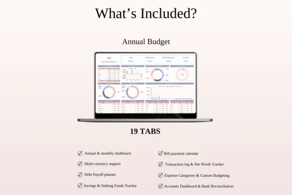 The Travel Planner helps you organize trip details, travel expenses, packing lists, and important travel information. The Simple Monthly Budget in Rainbow Style makes budgeting more enjoyable with a colorful and beginner-friendly design. The Debt Payoff Tracker helps you visualize your debt-free journey, while the Annual Budget Template gives you a complete year-round financial overview. The Sinking Funds Tracker helps you save intentionally for future expenses such as holidays, gifts, repairs, maintenance, special events, and planned purchases.