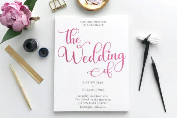 Wedding invitations, save-the-date cards, bridal stationery, greeting cards, romantic quotes, feminine logos, boutique branding, product packaging, labels, stickers, social media posts, printable wall art, fashion designs, signature-style text, and elegant marketing materials.