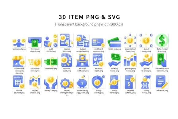 This set includes 30 money and finance business icons, making it a practical resource for a wide range of uses such as websites, mobile apps, dashboards, presentations, infographics, branding materials, online business graphics, reports, and financial marketing content. The icons are designed in a modern style that helps communicate financial concepts clearly while keeping layouts polished and professional.