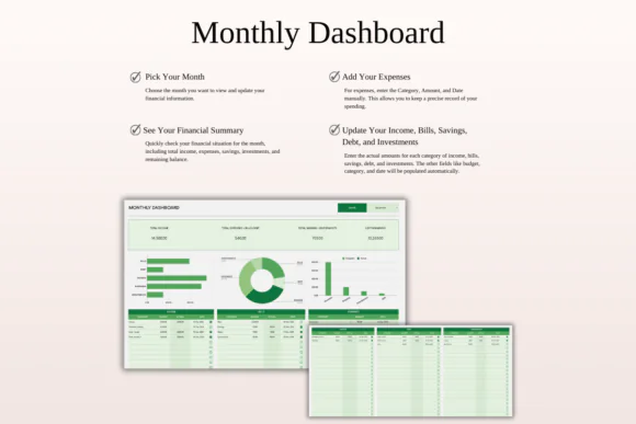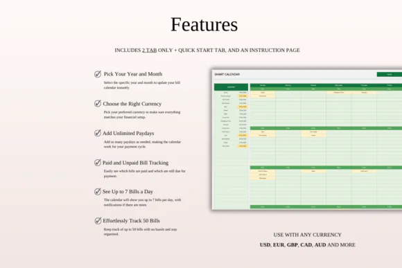 The Green Theme gives the tracker a clean and calming look, while automatic calculations and paid/unpaid status tracking help you stay practical and efficient. Whether you use it for personal finances or small business expenses, this template helps you stay prepared and avoid missed payments.
