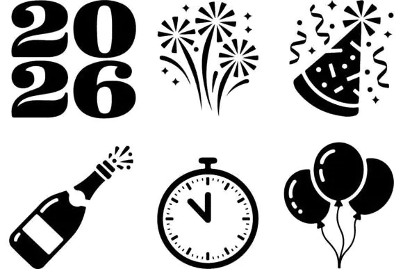 These New Year 2026 icons are a fun and practical design resource for creating festive seasonal projects with a modern, bold, and celebratory look.