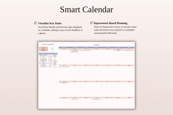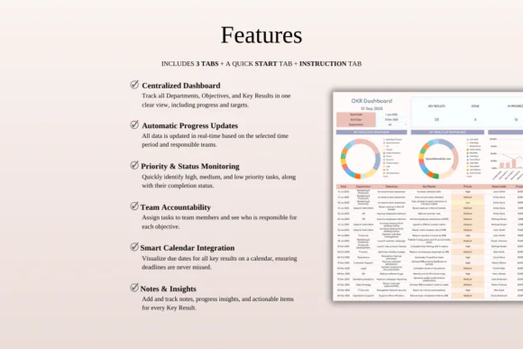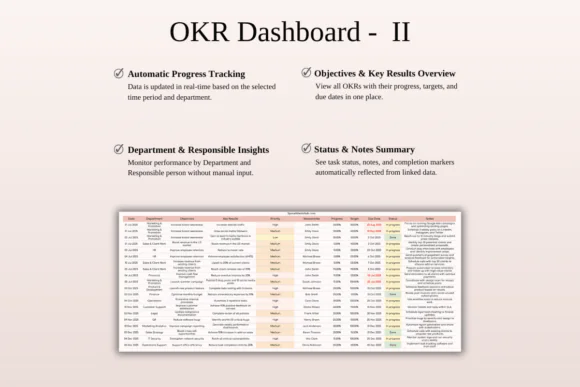 The template includes an all-in-one OKR dashboard where you can view objectives, key results, departments, priorities, status, completion percentages, due dates, notes, and action items in one organized layout. You can assign specific key results to team members, track their progress, and quickly identify which goals need attention.