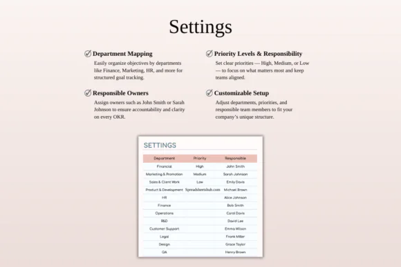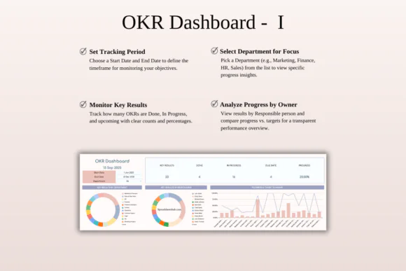 This OKR tracker is perfect for teams and businesses that want a simple but powerful way to manage goals across departments. Whether you are working in marketing, sales, HR, finance, product development, operations, customer support, or project management, this template can be customized to match your workflow and business priorities.