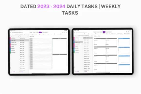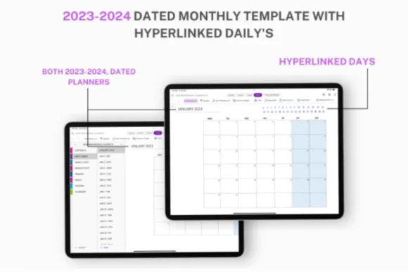 This planner includes a broad set of productivity-focused sections to support both everyday task management and bigger-picture planning. It features 2023–2024 monthly planning, daily and weekly task pages, project management tools, goal planning, meeting management, and a to-do list template, making it useful for business, freelance, office, and professional workflows.