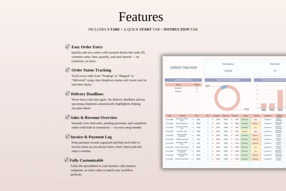 Keep your orders, sales, customer details, revenue, and fulfillment process organized with this Order Tracker Spreadsheet Template for Google Sheets and Microsoft Excel. Designed for small business owners, online sellers, freelancers, product-based businesses, digital product sellers, and fulfillment teams, this spreadsheet helps you manage every order in one clean and easy-to-use system.