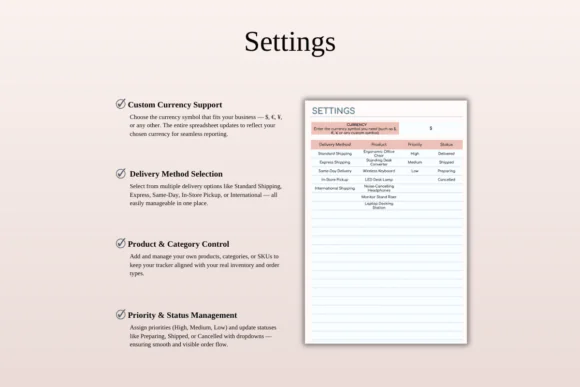 Customize currency, delivery types, status options, priority levels, and workflow preferences to match your business needs.
