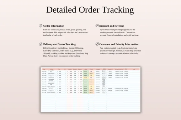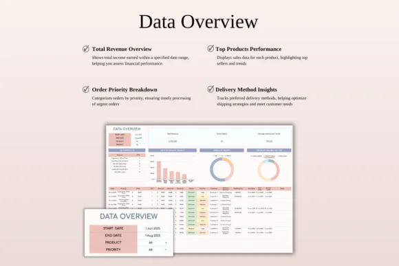 The color-coded fields make urgent orders easier to notice, while the dashboard gives you a quick view of sales performance. Whether you sell physical products, digital products, custom work, or services, this template helps you deliver a smoother and more organized customer experience.