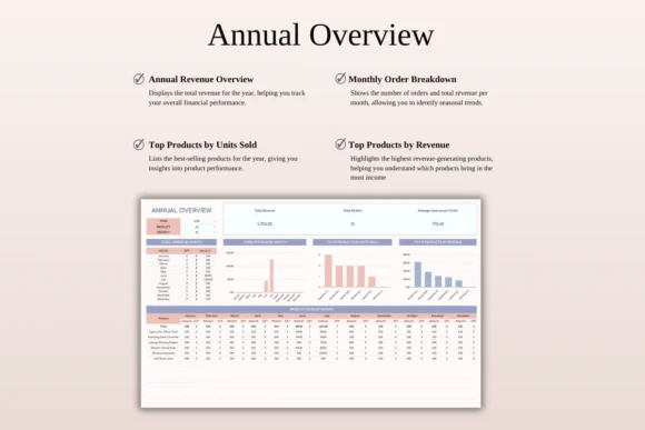 The template includes centralized order tracking, automatic calculations, live performance snapshots, color-coded status fields, order analysis tools, monthly and yearly sales summaries, and customizable settings. It helps you understand your order flow, monitor fulfillment progress, identify pending or urgent orders, and review sales trends over time.