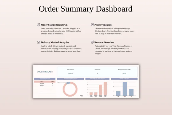 This template helps you stay in control of your sales and fulfillment process without needing expensive software or monthly subscriptions. You can track every order from entry to delivery, monitor revenue, manage priorities, and review order performance in one spreadsheet.