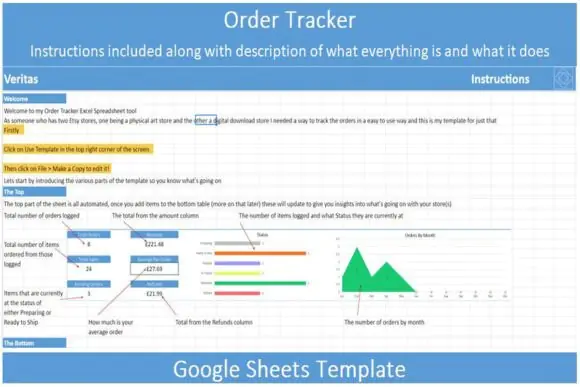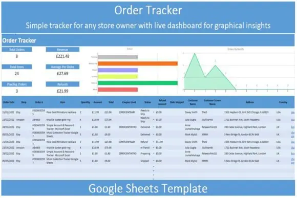 The template includes built-in automatic graphical insights that update as you enter new order information, helping you quickly understand order activity and business performance. You can also filter, sort, and search your order data, making it easier to find specific orders, customers, products, or delivery stages. It is designed for Google Sheets and can be accessed with a free Google account.