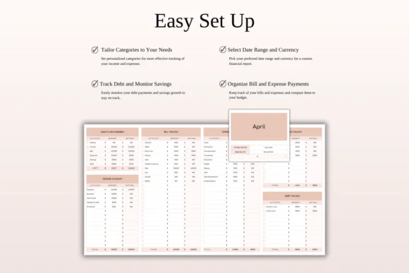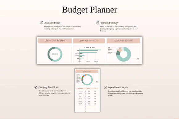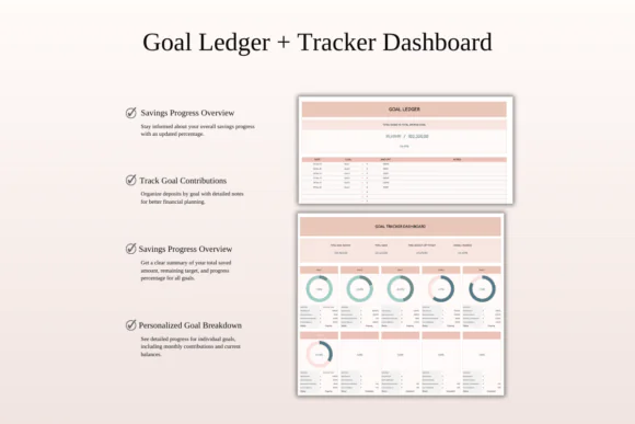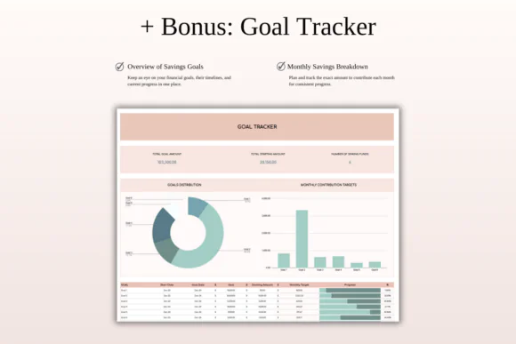 With built-in graphs and summaries, this finance tracker helps you view your cash flow, spending breakdown, budget remaining, and overall financial picture at a glance. It also includes checkboxes for bills, debt, and savings tracking, plus a bonus Goal Tracker tab to help you stay motivated while working toward financial milestones.