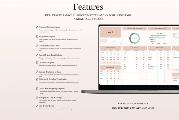 The one-tab layout makes budgeting simple and efficient. You can enter your transactions, customize your categories, set your initial balance, and let the spreadsheet automatically calculate your budget progress. It supports monthly, weekly, and biweekly budgeting, making it flexible for different income schedules and planning styles.