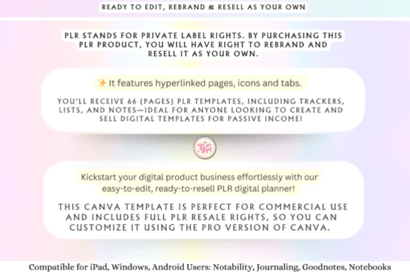 Because this is an undated planner, it can be reused again and again without expiring, making it a practical option for customers and a flexible product for sellers. The package includes 66 PLR templates covering planning, productivity, health, and finance, which makes it a strong all-in-one digital planner product.