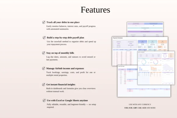 This bundle is perfect for anyone who wants a simple, visual, and beginner-friendly system for managing personal finances, debt payoff plans, bill schedules, and short-term rental income. Whether you are working toward financial freedom, trying to avoid missed bills, or managing income and expenses from an Airbnb or rental property, these spreadsheets give you practical tools in one organized package.