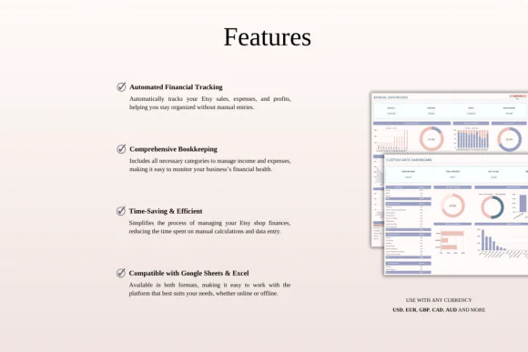The Premium Templates for Etsy Seller bundle is a practical bookkeeping toolkit for shop owners who want to save time, reduce financial confusion, and better understand their Etsy business performance. With automated formulas, clean layouts, and dedicated templates for income, expenses, fees, and profit tracking, this bundle helps you stay organized and run your Etsy shop with more confidence.