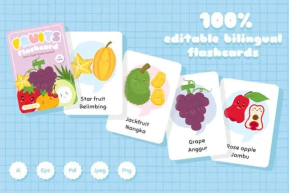 These Printable Fruits Bilingual Flashcards are a versatile and engaging resource for helping learners study fruit vocabulary in English and Indonesian while enjoying colorful, illustration-based language practice.