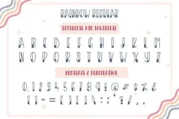 Rainbow Font is perfect for designers, crafters, teachers, stationery creators, print-on-demand sellers, social media designers, and small business owners who want a fun and decorative typeface for cute, colorful, and family-friendly projects. Its bold letterforms combined with playful decorative elements make it ideal for creating joyful designs that stand out.