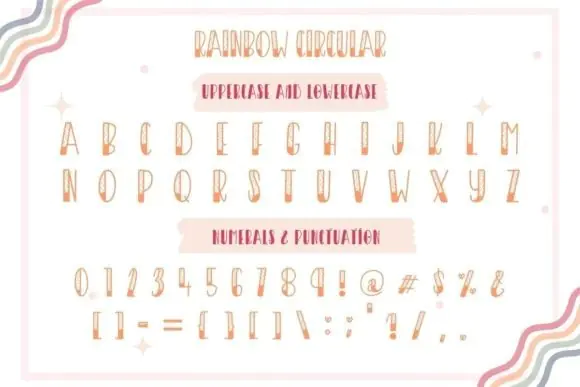 Create cheerful, playful, and eye-catching designs with Rainbow Font, a cute decorative font collection designed to add fun personality to your creative projects. This font set includes 5 different styles — circle, line, star, heart, and regular — giving you flexible options to create bright, charming, and unique typography for many types of designs.