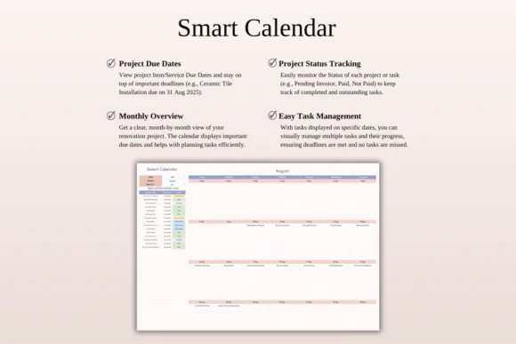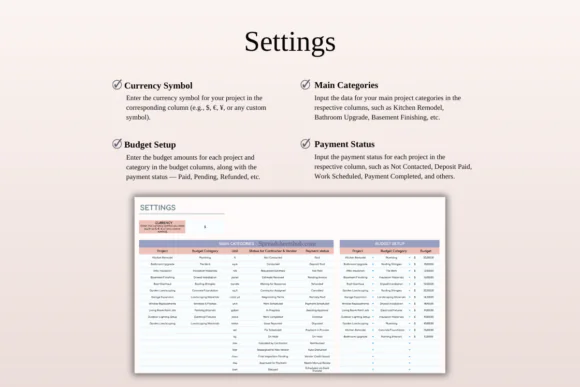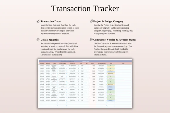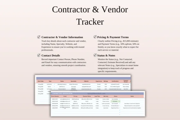 This renovation tracker is ideal for homeowners who want to reduce stress during remodeling, contractors managing multiple project details, or project managers who need a simple but effective spreadsheet-based system. It is fully editable, easy to use, and customizable to match different renovation styles, project sizes, and budget requirements.