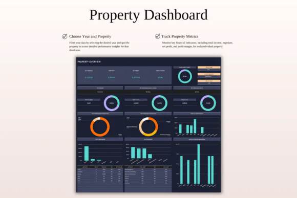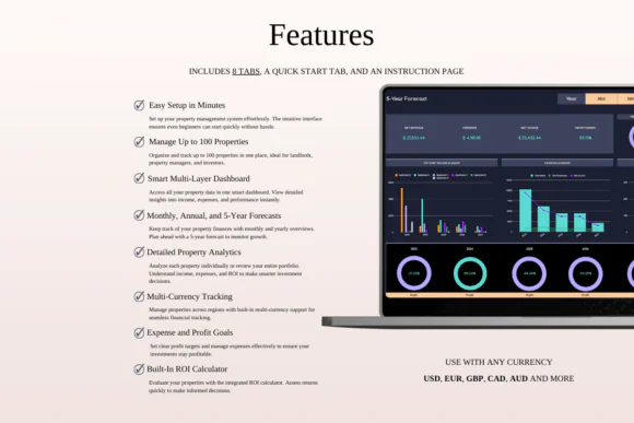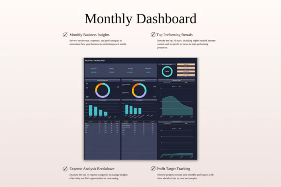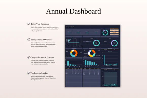 The template includes a multi-layer smart property dashboard, property-specific management dashboard, monthly rental dashboard, annual management dashboard, comparison views, 5-year forecast dashboard, ROI calculator, tax report, and income and expense tracker. These tools help you analyze monthly financials, compare income vs. expenses, identify top-performing properties, review rental channels, manage profit goals, and monitor expense budgets.