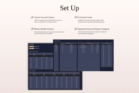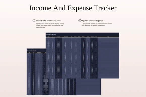 The income and expense tracker includes flexible categories, subcategories, multi-currency support, and automation to reduce manual errors. The dark theme layout gives the spreadsheet a clean, professional, and comfortable look while keeping your rental data easy to read and manage.