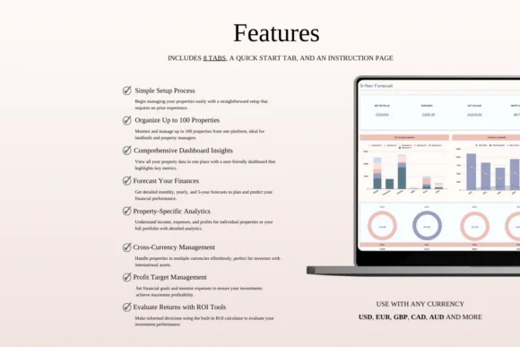 With multi-currency support, dynamic categories, subcategories, and automation, this spreadsheet helps reduce manual work and improve accuracy. The 5-year projection dashboard helps you forecast future profitability, while the ROI calculator supports investment planning and property purchase analysis.